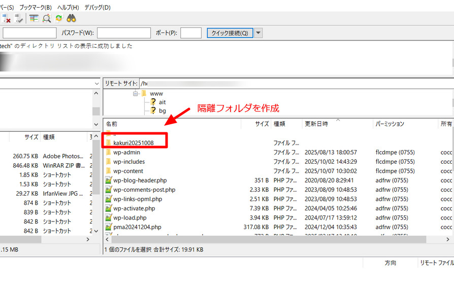 1 FTPソフトウェアでサイトのサーバーにアクセスし、長めの予測不可能な名称の隔離フォルダを作成します
