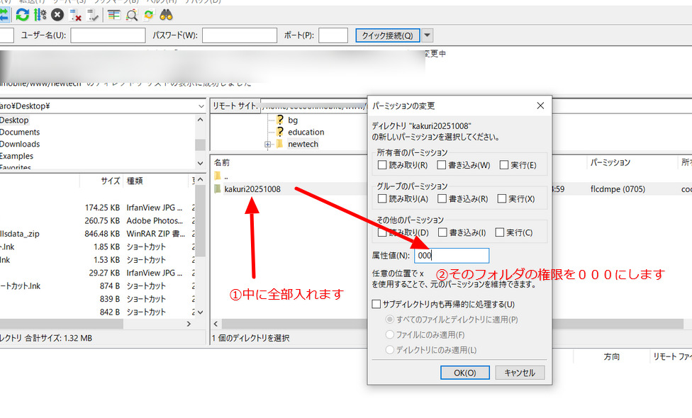 2 その中にワードプレスのファイルを全部入れてパーミッション(書き込み権限)を編集もアクセスもできない000にします