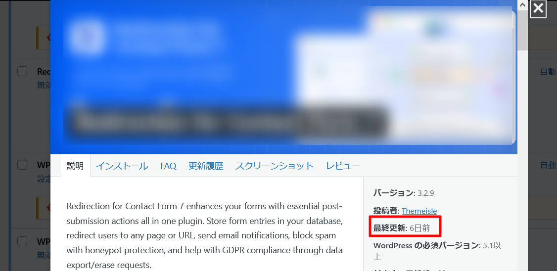 ※プラグインが長期間更新が無いかどうかはプラグイン一覧画面の詳細を表示して最終更新日時調べることで把握できます